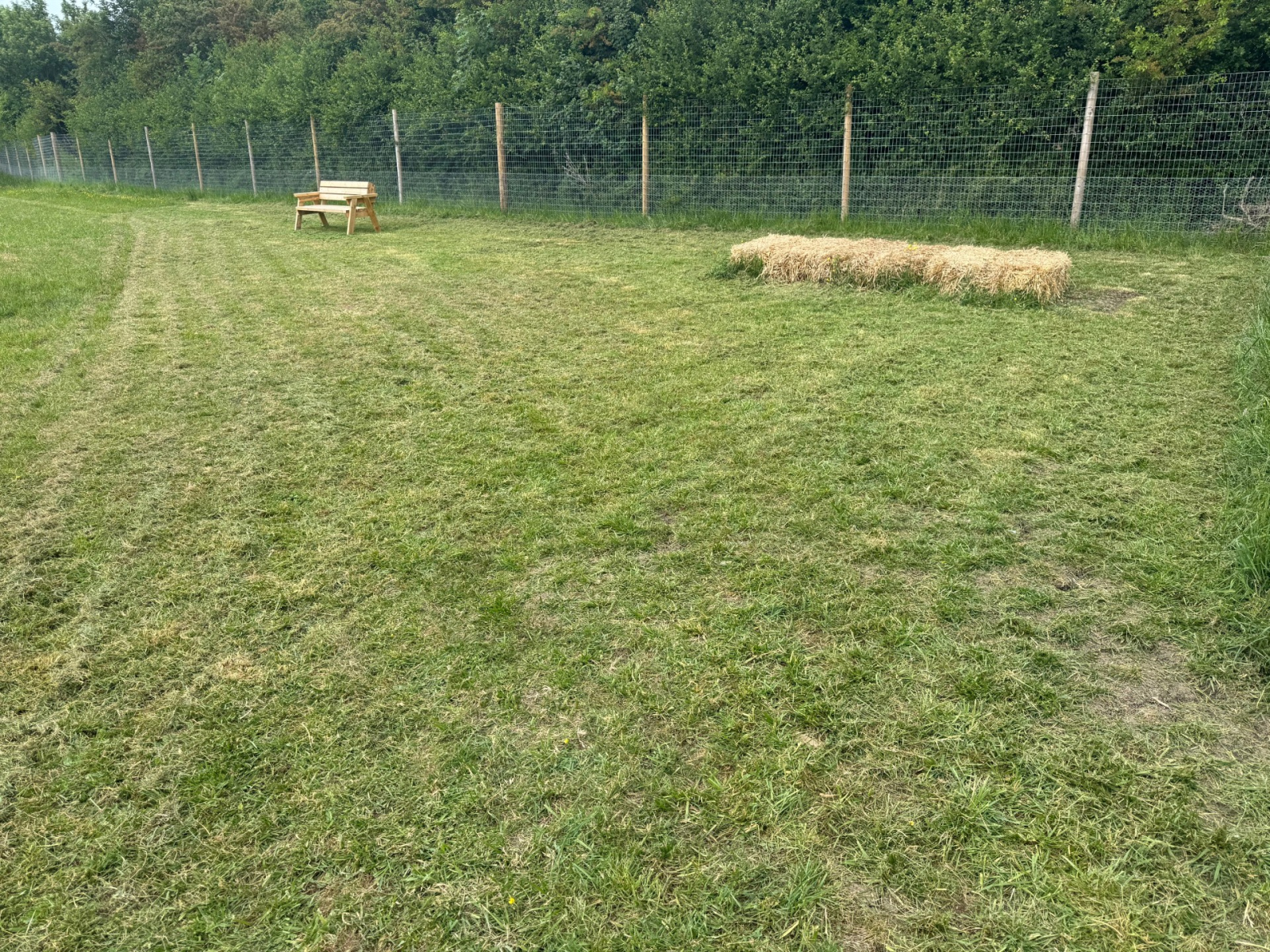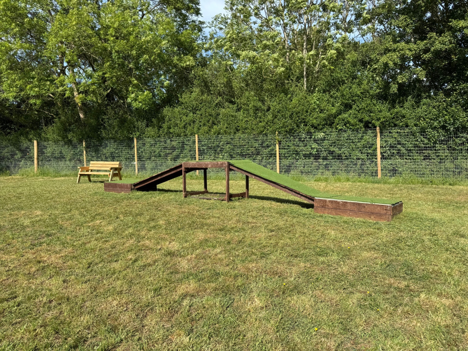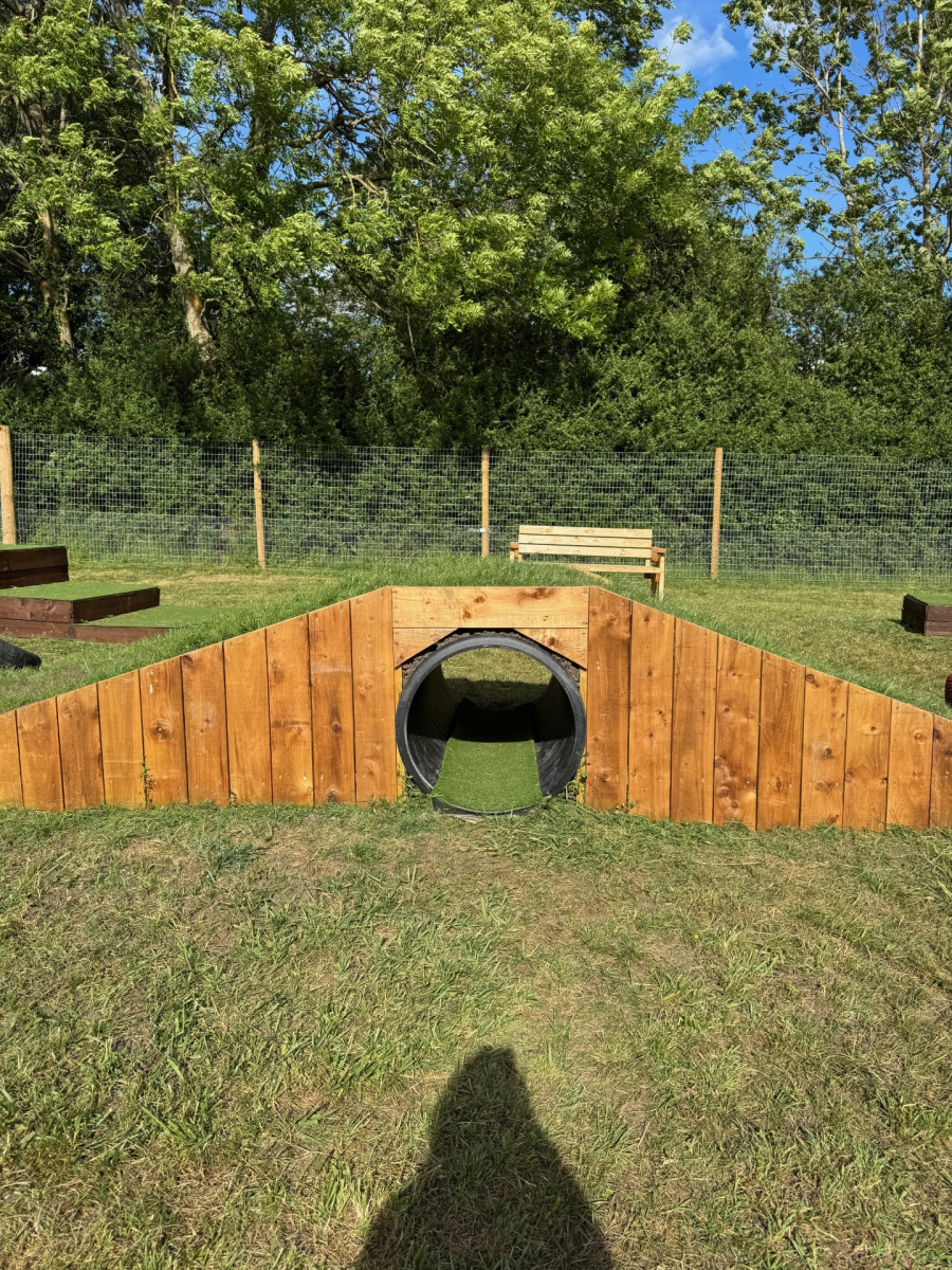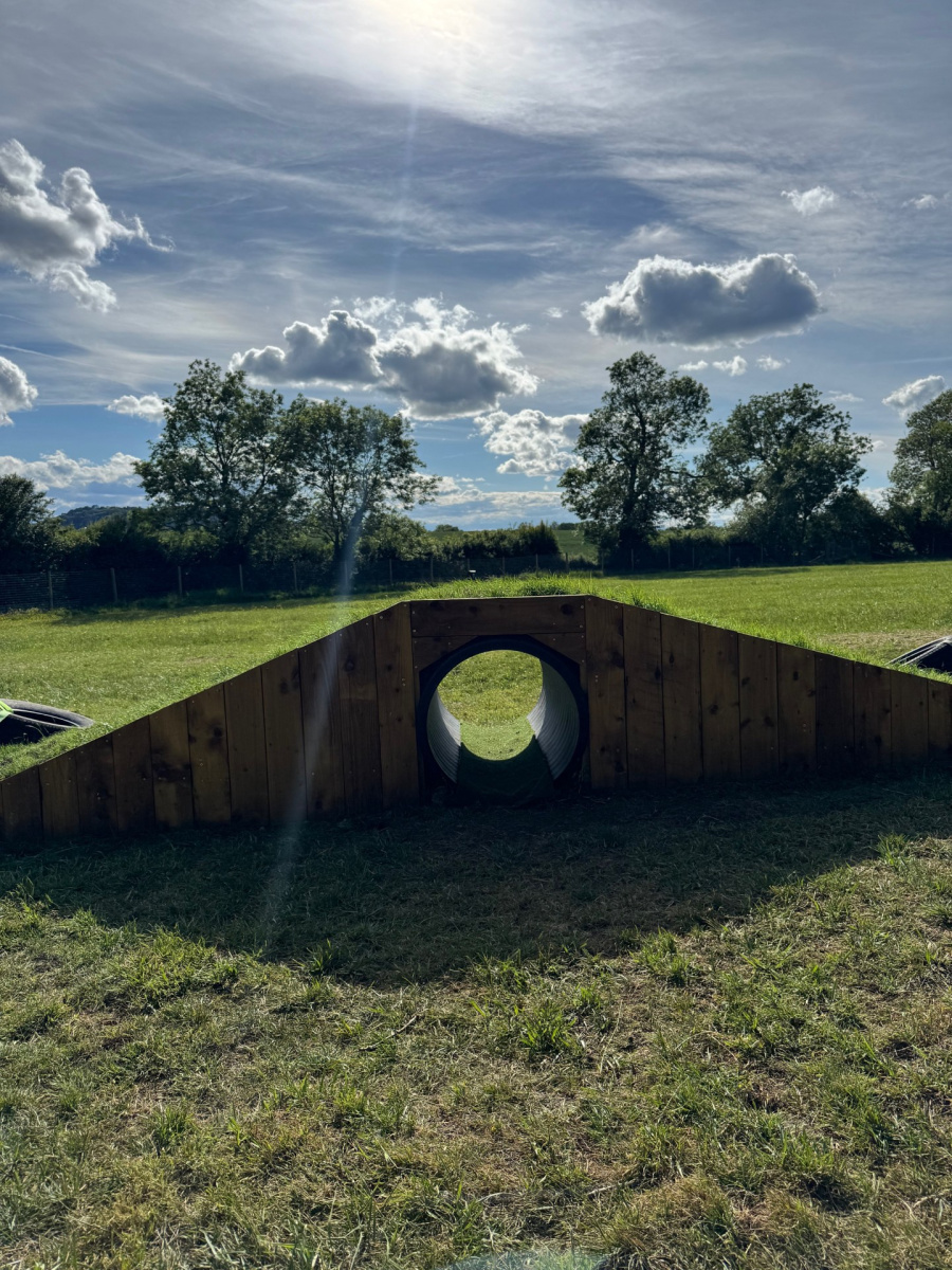 We thought you might like to see some photos of our beautiful Moochy Pooch field, located in Cheltenham, Gloucestershire. Take a look to see what you can expect when you visit! Our fully enclosed dog field features high perimeter fencing for safety, along with handy amenities like dog waste and litter bins, benches, play equipment, a first aid kit, and a convenient car park. You’ll also find lovely wildflowers and scenic views that make every visit a pleasure. If you like what you see and would like to come along, head over to our booking page to choose a day and time that works for you – and treat your dog to some fun!